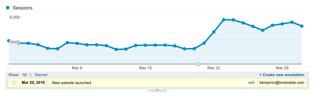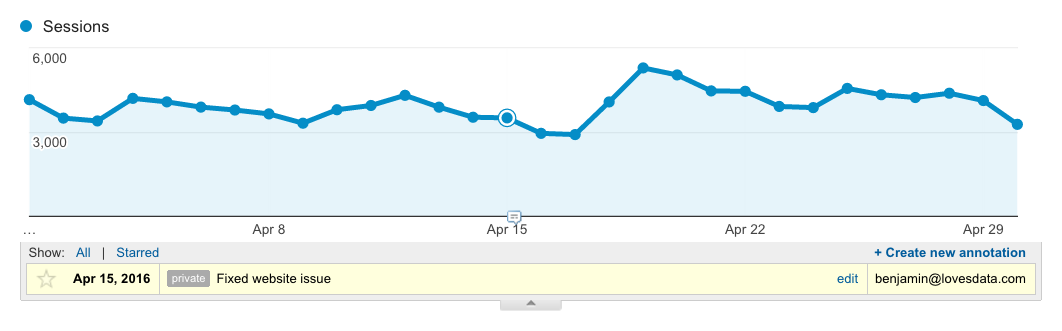 You can use annotations to mark important dates within your reports. Since annotations are all about providing context, you should consider creating them for any changes that might impact your data. Anything that has caused a spike or dip in traffic is usually important to add as an annotation. Here are some suggestions to get you started:
